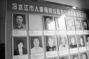 | 2010年12月底,湖南冷水江市人事局局长曹长清将大学尚未毕业的儿子安排到财政局工作,被网络曝光。公示栏上排左一为曹长清的照片。现在曹长清已经退居二线(2010年12月26日摄)。 新华社发 |