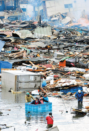 | ↑12日,宫城县气仙沼市人们用大塑料箱转移被水和废墟围困的民众。 新华社/路透 |