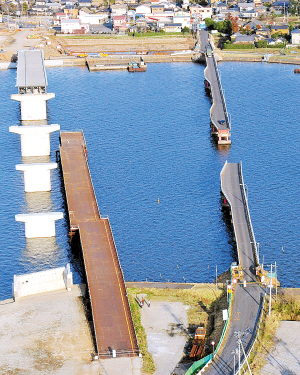 | →3月12日,位于日本茨城霞浦的鹿行大桥(右)因地震而倒塌,旁边一座在建中的大桥也受到波及。