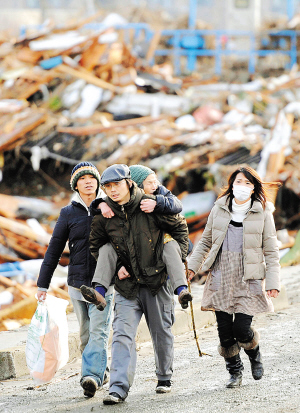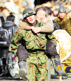| ←十二日,在日本宫城县气仙沼市,一名自卫队队员背着当地居民撤离。 新华社/法新 |