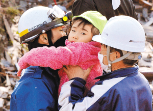 | ←十二日,在宫城县气仙沼市,救援人员从建筑物中救出小女孩。 新华社/共同社 |