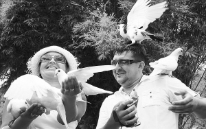 | 俄罗斯游客在南山享受鸽趣。 程范淦 摄 |