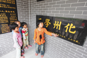 | 今年七岁的黎华芳(右一)平时她喜欢教小朋友们读书,还能讲解一些牌匾的来历 |