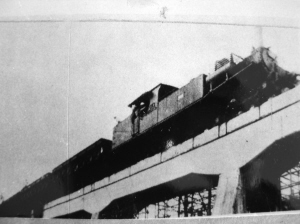 | 日寇第一列装满海南铁矿石的火车经过矿桥的情景。 |