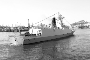 中国海军第八批护航编队的“马鞍山”舰13日驶离巴基斯坦卡拉奇港。 新华社发