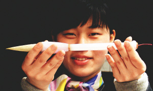 3月14日,山东省济南市一家金店的工作人员在展示价值7万元的翡翠毛笔摆件。 翡翠毛笔摆件的笔杆以天然翡翠为原料、采用传统工艺制成,色泽柔和,质地细腻,笔头则以羊毫制成。 新华社发