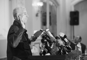 | 3月13日,利比亚武装部队发言人法格希在首都的黎波里举行的记者招待会上讲话。 新华社记者 杨光 摄 |