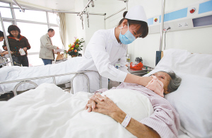 镜头二 3月3日下午5时许,海口市人民医院一优质护理病房,65岁的老人陈进旧在护士的帮助下,正准备去洗澡。看到记者走进病房,老人笑哈哈地开起玩笑:“我这是回娘家来了。”原来,老人有多种慢性病,从12年前开始,只要一发病,她就会选择到海口市人民医院看病。陈进旧说,老伴年纪大了,身体也有病,两个女儿又在外地工作,她住院没有亲人陪护,全靠护士照顾。