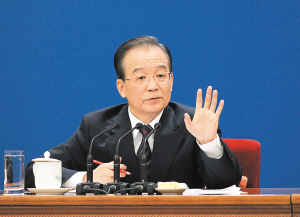 | 3月14日,国务院总理温家宝在北京人民大会堂与中外记者见面并回答记者提问。 本报特派记者 李英挺 摄 |