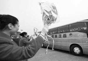 ←3月14日,第十一届全国人民代表大会第四次会议闭幕后,服务人员手持鲜花欢送全国人大代表。 新华社记者 岳月伟 摄