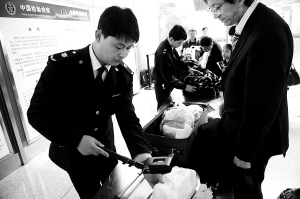 3月16日,检验检疫人员通过便携式核辐射检测仪对从日本东京飞抵青岛的NH927航班旅客行李进行放射性检测。 3月15日开始,针对日本大地震造成的核电站放射性物质泄漏等情况,青岛检验检疫局加强对灾后日本入境航班人员、行李及货物的放射性检测。 新华社记者 李紫恒 摄