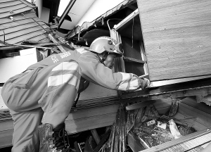 | 三月十六日,在日本宫城县大船渡市重灾区,一名中国国际救援队队员在被海啸冲毁的民房外查看。 新华社记者 陈建力 摄 |