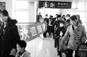 | 3月16日,从日本飞抵青岛的中国公民在“归国公民入境特别通道”排队等候入关。 新华社记者 李紫恒 摄 |