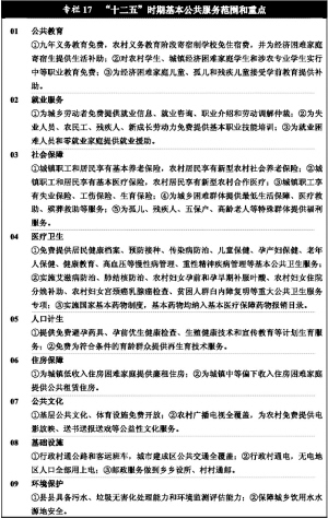 目  录   第一篇  转变方式  开创科学发展新局面   第一章  发展环境   第二章  指导思想   第三章  主要目标   第四章  政策导向   第二篇  强农惠农  加快社会主义新农村建设   第五章  加快发展现代农业   第六章  拓宽农民增收渠道   第七章  改善农村生产生活条件   第八章  完善农村发展体制机制   第三篇  转型升级  提高产业核心竞争力   第九章  改造提升制造业   第十章  培育发展战略性新兴产业   第十一章  推动能源生产和利用方式变革   第十二章  构建综合交通运输体系   第十三章  全面提高信息化水平   第十四章  推进海洋经济发展   第四篇  营造环境 推动服务业大发展   第十五章  加快发展生产性服务业   第十六章  大力发展生活性服务业   第十七章  营造有利于服务业发展的环境   第五篇  优化格局  促进区域协调发展和城镇化健康发展   第十八章  实施区域发展总体战略   第十九章  实施主体功能区战略   第二十章  积极稳妥推进城镇化   第六篇  绿色发展  建设资源节约型、环境友好型社会   第二十一章  积极应对全球气候变化   第二十二章  加强资源节约和管理   第二十三章  大力发展循环经济   第二十四章  加大环境保护力度   第二十五章  促进生态保护和修复   第二十六章  加强水利和防灾减灾体系建设   第七篇  创新驱动  实施科教兴国战略和人才强国战略   第二十七章  增强科技创新能力   第二十八章  加快教育改革发展   第二十九章  造就宏大的高素质人才队伍   第八篇  改善民生  建立健全基本公共服务体系   第三十章  提升基本公共服务水平   第三十一章  实施就业优先战略   第三十二章  合理调整收入分配关系   第三十三章  健全覆盖城乡居民的社会保障体系   第三十四章  完善基本医疗卫生制度   第三十五章  提高住房保障水平   第三十六章  全面做好人口工作   第九篇  标本兼治  加强和创新社会管理   第三十七章  创新社会管理体制   第三十八章  强化城乡社区自治和服务功能   第三十九章  加强社会组织建设   第四十章  完善维护群众权益机制   第四十一章  加强公共安全体系建设   第十篇  传承创新  推动文化大发展大繁荣   第四十二章  提高全民族文明素质   第四十三章  推进文化创新   第四十四章  繁荣发展文化事业和文化产业   第十一篇  改革攻坚  完善社会主义市场经济体制   第四十五章  坚持和完善基本经济制度   第四十六章  推进行政体制改革   第四十七章  加快财税体制改革   第四十八章  深化金融体制改革   第四十九章  深化资源性产品价格和环保收费改革   第十二篇  互利共赢  提高对外开放水平   第五十章  完善区域开放格局   第五十一章  优化对外贸易结构   第五十二章  统筹“引进来”与“走出去”   第五十三章  积极参与全球经济治理和区域合作   第十三篇  发展民主  推进社会主义政治文明建设   第五十四章  发展社会主义民主政治   第五十五章  全面推进法制建设   第五十六章  加强反腐倡廉建设   第十四篇  深化合作  建设中华民族共同家园   第五十七章  保持香港澳门长期繁荣稳定   第五十八章  推进两岸关系和平发展和祖国统一大业   第十五篇  军民融合  加强国防和军队现代化建设   第五十九章  加强国防和军队现代化建设   第六十章  推进军民融合式发展   第十六篇  强化实施  实现宏伟发展蓝图   第六十一章  完善规划实施和评估机制   第六十二章  加强规划协调管理   中华人民共和国国民经济和社会发展第十二个五年(2011-2015年)规划纲要,根据《中共中央关于制定国民经济和社会发展第十二个五年规划的建议》编制,主要阐明国家战略意图,明确政府工作重点,引导市场主体行为,是未来五年我国经济社会发展的宏伟蓝图,是全国各族人民共同的行动纲领,是政府履行经济调节、市场监管、社会管理和公共服务职责的重要依据。 (下转A3版)     (上接A1版)   第一篇  转变方式  开创科学发展新局面   第一章  发展环境   “十二五”时期,世情国情继续发生深刻变化,我国经济社会发展呈现新的阶段性特征。综合判断国际国内形势,我国发展仍处于可以大有作为的重要战略机遇期,既面临难得的历史机遇,也面对诸多可以预见和难以预见的风险挑战。我们要增强机遇意识和忧患意识,主动适应环境变化,有效化解各种矛盾,更加奋发有为地推进我国改革开放和社会主义现代化建设。   从国际看,和平、发展、合作仍是时代潮流,世界多极化、经济全球化深入发展,世界经济政治格局出现新变化,科技创新孕育新突破,国际环境总体上有利于我国和平发展。同时,国际金融危机影响深远,世界经济增长速度减缓,全球需求结构出现明显变化,围绕市场、资源、人才、技术、标准等的竞争更加激烈,气候变化以及能源资源安全、粮食安全等全球性问题更加突出,各种形式的保护主义抬头,我国发展的外部环境更趋复杂。我们必须坚持以更广阔的视野,冷静观察,沉着应对,统筹国内国际两个大局,把握好在全球经济分工中的新定位,积极创造参与国际经济合作和竞争新优势。   从国内看,工业化、信息化、城镇化、市场化、国
