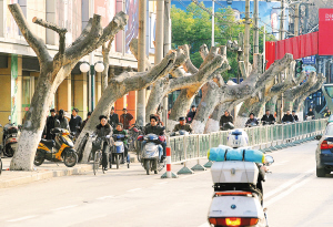 | 南京太平南路一地铁施工点附近的一排梧桐“修整”后留下树干。 新华社记者孙参摄 |