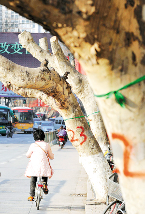 记者在南京太平南路、太平北路与中山东路的交界处看到,和以往一排梧桐树形成的靓丽风景线形成鲜明对比的是,道路的两侧已变成了光秃秃的一片。据家住附近的南京市民陈少华介绍,这里的几十棵树是在3月9日左右被移走的。顺着太平南路往南走,记者在太平南路和常府街交叉口附近看到,沿太平南路两侧的20多棵法国梧桐,树身上喷涂上了编号,随时准备进行迁移。