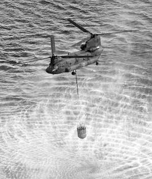 | ←3月17日,一架日本自卫队的直升飞机从海洋中取水,对福岛第一核电站进行冷却作业。 新华社/路透 |