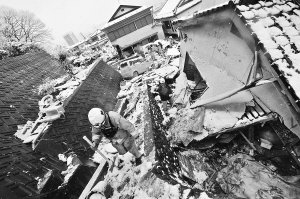 两名灾区搜救善后行动参与人员在碎石堆里发现几张照片,弯腰捡起,装入一只盒子。