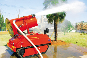 3月17日,消防机器人在进行射水测试。 当日,一台价值80余万元的消防排烟机器人正式装备安徽淮北消防部队。该机器人具有灭火喷射、排烟降尘、实时探查等功能,可原地转向、爬40度坡和在150米内无线遥控作业。 新华社发(万善朝 摄)