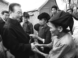 | 3月18日,温家宝在盈江县弄璋镇贺哈村看望受灾群众。新华社发 |