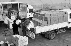 3月19日,潍坊盐业公司仓储配送中心员工在装运食用盐。 潍坊作为全国最大的原盐生产基地,拥有得天独厚的地下卤水资源,所产海盐为地下80米深卤水提炼而来,年原盐生产能力达1600万吨,约占全国原盐产量的四分之一。 新华社记者 李晓果 摄