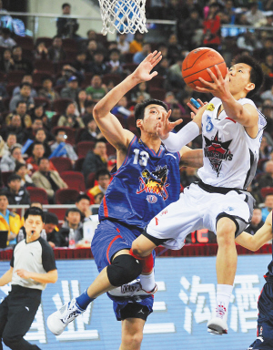 | 3月19日,在CBA全明星周末星锐赛中,北方队郭艾伦(右)上篮。 新华社发 |