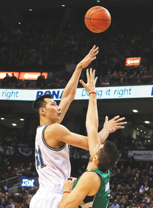 北京时间3月19日,在NBA常规赛中,多伦多猛龙队主场以116:107击败华盛顿奇才队。此场比赛奇才队中国球员易建联连续第三场首发,得到9分。图为易建联(左)在比赛中投篮。 新华社发
