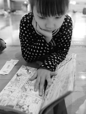 | 3月19日,一位7岁的华人小姑娘在日本新澙临时安置点内看漫画。