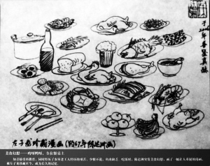画漫画本是轻松的事,欣赏漫画也是快乐的事。但眼前的这样一幅漫画,却让画的人画得辛酸,看的人看得苦涩———漫画的作者是广东知青陈达洲,他用自己富有想象力的灵感,用他那细腻的笔触,描绘出一顿想象中的丰盛美餐,完成了一次饥饿中的望梅止渴。
