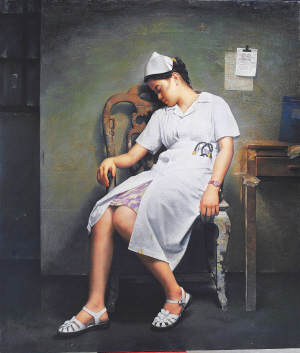 可能也关乎梁峰的童年经历与母亲情结,他的童年有太多白衣白墙的记忆,他做医生的母亲救死扶伤的情怀深深植入梁峰童年的血液里,所以他画作的主角多是白衣天使,又或是穿白衣服的女孩,她们是圣洁的天使、是圣母、是梁峰无尘的精神世界。梁峰善良敏感、单纯恬静、内秀内敛,所以他的画有种宁静致远的淡泊漂渺;梁峰有同情心,所以他的画有悲天悯人的情怀。他希望生活在纯净的世界里,他笔下的人物都是他的理想。他喜欢一个人关在安静的画室里画画,那儿隔开了市井的势利庸俗、烦嚣浮躁,耳伴听着悠悠的《圣母颂》,怀着一颗虔诚的心与他画中的人物交流。