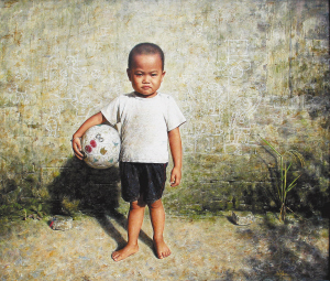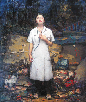 原以为梁峰画面上静谧圣洁的女孩都是闭着眼,或是侧着脸让人遐想的。但《五月·北川》那哀伤的眼神,还有面颊上的泪痕却是那么的感人……,这一切都源于梁峰坚实的造型能力。1998年我曾与梁峰兄同在广州美术学院油画系研究生班学习,深为他学习的勤勉与耐力所折服,这为他今天可以游刃有余地深入刻画对象打下良好的基础。再深奥的思想也必须通过特殊的技巧明白地、艺术地、流畅地表达出来。十多年前梁峰在广州美院油