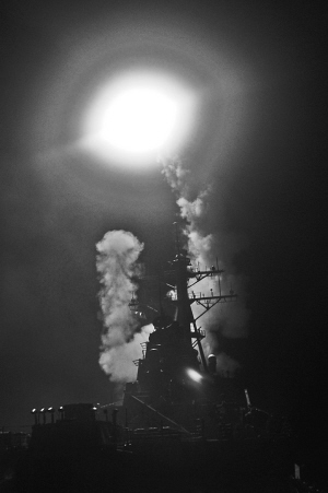 | 美国海军“巴里”号导弹驱逐舰向利比亚发射“战斧”巡航导弹。