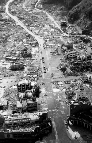↑ 3月19日,日本国土地理院宣布,位于震中西北部的宫城县牡鹿半岛向震中所在的东南方向移动了约5.3米,同时下沉了约1.2米,这是日本有观测史以来最大的地壳变动记录。图为海啸袭击日本宫城县女川镇一周后的景象。 新华社/共同社