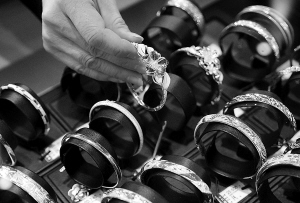 3月21日,在银川市某大型商场内,工作人员取出金手镯供市民挑选。 日前,宁夏银川黄金饰品价格出现下降,银川市场上千足金的价格由原来的每克388元下降到每克382元左右。 新华社记者 彭昭之 摄