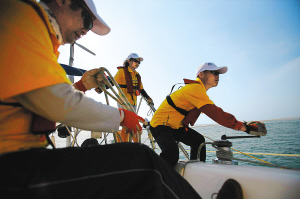 | 21日,在环海南岛国际大帆船赛海口到洋浦赛段的比赛中,船员们全神贯注驾驶帆船。 本报记者 张杰 摄 |