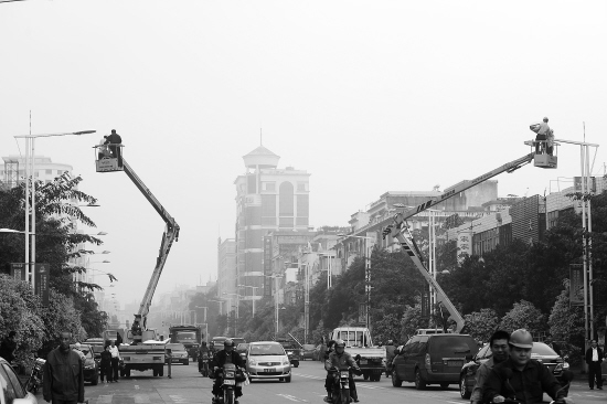 近日,新型LED混光高效节能路灯出现在琼海博鳌、官塘和嘉积等地区。该市计划在博鳌亚洲论坛2011年年会召开前将再安装5000多盏这样的节能灯。据介绍,LED混光高效节能路灯与原有路灯相比,节能达56%以上。特约记者 蒙钟德 摄