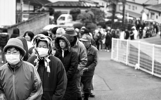 3月21日,在日本重灾区山田町,人们排队领取矿泉水和面包。 山田町每天发放两次物资,每人每次发放一瓶矿泉水和一块面包。虽然日本政府和志愿者已经尽了很大努力,但重灾区的物资供应仍然普遍紧张。 新华社记者 黄晓勇 摄
