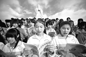 | 日前,海口新坡中学八(1)班的同学们在孔子雕像前朗读国学名作。