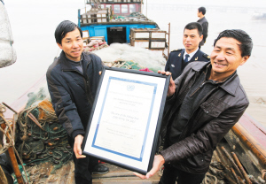 3月21日,在温州瑞安飞云江,平阳渔民苏顺弟(左)、苏苗培展示获得的国际海事组织2010年海上特别勇敢奖奖牌。当日,温州海上搜救中心工作人员将国际海事组织2010年海上特别勇敢奖奖牌送交浙江温州平阳渔民苏顺弟、苏苗培等5人,此奖项旨在表彰他们2009年9月29日在极其恶劣的海况下成功救起一艘轮船4名落水船员。 新华社发