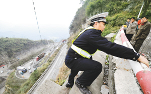 3月18日,湖南湘西吉首矮寨公路上,一辆货车在过“8”字型弯道弧顶时发生故障,导致整条公路严重拥堵,吉首市交警大队副大队长王五一率矮寨中队的交警火速赶到现场疏导交通。为了给车辆让路,一名交警翻过隔离护栏站在悬崖边,等车辆通过后又翻回路面。 新华社记者 赵众志 摄