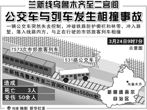 新华社乌鲁木齐3月24日电 (记者曹志恒、白志强)3月24日9时许,乌鲁木齐兰新铁路乌鲁木齐南站至二宫间K1886+550m处发生一起火车与公交车相撞的交通事故,一辆531路公交车失去控制,冲破铁路防护栅栏和林带,冲上铁轨后停下,行驶的7553次旅客列车与其相撞,造成3人当场死亡。