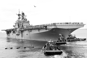 3月23日,在美国弗吉尼亚州诺福克海军基地,“巴丹岛”号两栖攻击舰离港。当天,美国海军派出由“巴丹岛”号两栖攻击舰、“弗德台地”号两栖船坞运输舰与“惠德比岛”号船坞登陆舰组成的两栖作战舰队,携舰载战斗机、海军陆战队和医疗设施前往地中海参与针对利比亚的军事行动。 新华社记者 张军 摄