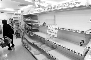 3月24日,在日本首都东京一家超市,瓶装水货架空空如也。 尽管东京都政府当天宣布,经过再次检测,东京自来水放射物指标已回落至婴幼儿可饮用水平。但由于受到23日宣布的13个地区自来水被确认含放射性物质影响,东京各大超市瓶装水被抢购一空,货源奇缺。 新华社记者 宋振平 摄