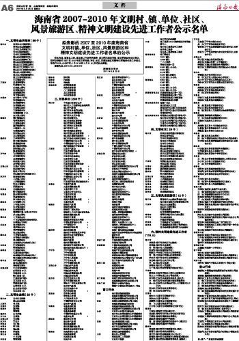 拟表彰的2007至2010年度海南省 文明村镇、单位、社区、风景旅游区和 精神文明建设先进工作者名单的公示 经各市县、省直各工委、省各窗口行业评选推荐,省文明办组织考核,省文明委全体会议审议,现将拟表彰的2007至2010年度文明村镇、单位、社区、风景旅游区和精神文明建设先进工作者名单进行公示。公示时间:3月25日至3月31日,欢迎社会监督。 监督电话:65371533、65331079 海南省文明办 2011年3月25日 一、文明生态示范村(98个) 海口市 秀英区永兴镇美孝村 秀英区东山镇福寨村 龙华区龙泉镇儒王村 龙华区新坡镇斌村 龙华区龙桥镇博潭村 琼山区红旗镇泮边村 琼山区红旗镇岭门村 琼山区红旗镇南畴湖村 琼山区三门坡镇龙鳞村 琼山区三门坡镇田心村 琼山区三门坡镇加乐湖村 琼山区大坡镇石桥村 美兰区大致坡镇洽教村 美兰区演丰镇宫后村 三江镇溪头村 三亚市 凤凰镇槟榔村 天涯镇文门村 田独镇上廖村 田独镇龙坡村 崖城镇梅西村 育才镇马亮村 文昌市 会文镇十八行村 东郊镇蓝田村 东阁镇排港村 东阁镇鳌头村 文城镇马园村 文教镇溪头村 龙楼镇宝陵17队 会文镇上旗村 琼海市 潭门镇福田村 塔洋镇鱼良村 中原镇书斋村 嘉积镇里邦村 大路镇文一村 石壁镇高堂村 阳江镇山尧村 龙江镇表园村 儋州市 兰洋镇南罗村 那大镇牛路窝村 排浦镇南华墟 新州镇英均四队 南丰镇红山村 雅星镇南坊村 万宁市 礼纪镇群坡村 长丰镇边肚村 龙滚镇福塘村 和乐镇六连村 后安镇六底村 五指山市 水满乡方好村 南圣镇什贺村 畅好乡草办村 冲山镇什保村委会番文村 东方市 板桥镇抱利村 八所镇八所村 八所镇福耀村 天安乡芭蕉村 四更镇沙村 定安县 龙湖镇高林村 岭口镇皇坡村 屯昌县 新兴镇加乐塘村 西昌镇南田村 枫木镇冯宅村 澄迈县 大丰镇那小村 大丰镇才存村 永发镇龙楼村 临高县 临城镇林银村 博厚镇三省、永顺、洋大片区 多文镇文潭村 昌江县 七叉镇宝山村 十月田镇南岭村委会经四队 石碌镇山竹沟村 乐东县 抱由镇抱由村 佛罗镇田头村 佛罗镇福塘村 抱由镇光明村 陵水县 文罗镇老吴园村 本号镇白水岭苗村 英州镇赤岭村 光坡镇武山村委会补山村 白沙县 打安镇地宝村 邦溪镇南征村 保亭县 三道镇什纳村 毛感村委会什春村 保城镇抄坑村委会抄茂村 响水镇陡水河村委会什赤村 琼中县 和平镇新民村 黎母山镇加林村 湾岭镇竹郎村 农垦总局 三江农场灿梅村 红明农场57队 东路农场13队 岭门农场3队 三道农场什根队 乌石农场43队 西联农场红卫队 山荣农场31队 红光农场向阳队 东红农场3队 二、文明生态镇(25个) 海口市 龙华区龙桥镇 琼山区红旗镇 三亚市 育才镇 文昌市 东阁镇 琼海市 嘉积镇 博鳌镇 儋州市 白马井镇 万宁市 龙滚镇 五指山市 毛阳镇 东方市 天安乡 定安县 龙门镇 屯昌县 枫木镇 澄迈县 福山镇 临高县 和舍镇 昌江县 石碌镇 十月田镇 乐东县 莺歌海镇 陵水县 新村镇 保亭县 什岭镇 琼中县 湾岭镇 农垦总局 红明农场场部 南滨农场场部 八一农场场部 龙江农场场部 乌石农场场部 三、文明单位(230个) 海口市 中共海口市委办公厅 海口市人力资源和社会保障局 海口市气象局 海口市水务集团(本部) 海口市公安局特警支队 海口市文化艺术馆 海口市城管支队 海口市保税区管委会 海口市秀英区检察院 海口市美兰区教育局 海口市英才小学 海口市高新区管委会 海口市琼山区委宣传部 海口美兰国际机场海关 ﹡ 海口边检总站秀英边检站 ﹡ 中国移动海口分公司 ﹡ 中国联通海口分公司 ﹡ 建行海南省分行营业部 ﹡ 三亚市 三亚市气象台 三亚市国家税务局 三亚市实验中学 三亚市边防检查站 三亚市委办公室 三亚市纪检监察局 三亚市旅游发展委员会 三亚市邮政局 ﹡ 中国电信三亚分公司 ﹡ 三亚市园林环卫管理局 ﹡ 中国移动三亚分公司 ﹡ 中国联通三亚分公司 ﹡ 建行三亚分行 ﹡ 三亚地方税务局田独税务所﹡ 文昌市 文昌市气象局 文昌市国家税务局 文昌市第三中学 文昌市公安边防支队 文昌市农技局 文昌市林业局 海南外国语职业学院 ﹡ 文昌供电局 ﹡ 琼海市 琼海市气象局 琼海市财政局 琼海市广播电视台 琼海市人口与计划生育委员会 琼海市国家税务局 琼海市中医院 海南软件职业技术学院 中国电信琼海分公司 ﹡ 中行琼海分行 ﹡ 琼海地方税务局 ﹡ 儋州市 儋州市财政局 儋州市中等职业技术学校 儋州市东坡书院管理处 儋州供电局 儋州气象局 儋州市国家税务局 儋州新华书店有限公司 儋州地方税务局办税大厅 ﹡ 万宁市 万宁气象局 万宁市财政局 万宁市邮政局 万宁市人民医院 万宁市供电局 万宁市国家税务局 五指山市 五指山市气象局 五指山市财政局 五指山市供电局 五指山市国家税务局 五指山市邮政局 东方市 东方市自来水公司 东方市国家税务局 国电大广坝发电有限公司 东方市气象局 东方市铁路中学 东方市邮政局 ﹡ 定安县 定安县公路局 定安县公安局 人行定安县支行 中国移动定安分公司 定安县气象局 屯昌县 屯昌县财政局 屯昌县教育局 屯昌县检察院 中国移动屯昌分公司 屯昌供电局 ﹡ 澄迈县 澄迈县公安局 澄迈县气象局 澄迈县检察院 澄迈县国家税务局 澄迈县老城经济开发区 临高县 临高县委办公室 临高县检察院 临高县农业局 临高中学 昌江县 昌江县职业教育中心 昌江县委办公室 