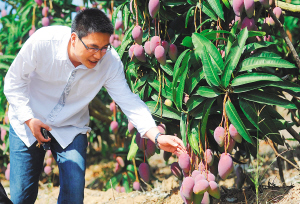 3月23日,三亚崖城镇数万亩芒果悬挂枝头,令人馋涎欲滴。图为技术人员在三亚施顿农业综合开发有限公司芒果园里察看芒果成熟情况。 本报记者 苏建强摄