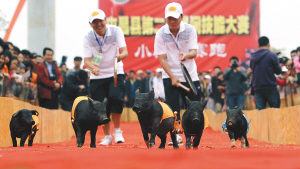 屯昌黑猪是屯昌县一宝。那么,屯昌小黑猪奔跑起来会是什么样子呢?听说有小猪赛跑,四面八方的群众纷纷赶到比赛现场,等待比赛开始。根据规则要求,参加比赛的屯昌小黑猪的重量都在50斤以下。在一声紧密的锣声后,工作人员将预备栏打开,8只小黑猪撒腿就跑。小黑猪憨态可掬的样子引得在场观众哈哈大笑。锣声、呐喊助威声交织在一起,比赛现场好不热闹,最终乌坡镇养猪专业户陈禄章带来的小黑猪获得第一名。