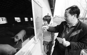 | 湖北省商务厅干部李良雄(右)在湖北省枝江市问安镇袁码头村向该村回乡创业的大学生田华敬(左)了解生猪养殖情况。 新华社发 |