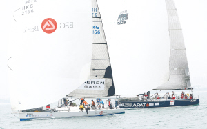 26日,“中粮·亚龙湾杯”2011年环海南岛国际大帆船赛在三亚收帆。最终,“亚派号”夺得竞赛组(IRC)冠军,“湖溪号”夺得公开组(ARCH)冠军。图为“亚派号”(右)等参赛船只在三亚湾海域进行的场地赛中。 本报记者 宋国强 摄