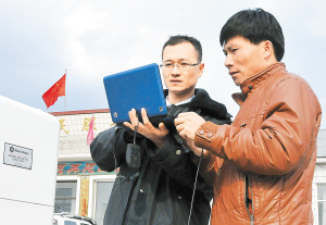 | ↑ 3月27日,技术人员在黑龙江省东宁县老黑山镇移动辐射监测点调取电离室数据。