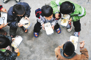 记者日前在该县部分农村寄宿制小学采访了解到,撤点并校后,大部分寄宿制学校难以配备标准化食堂,有些学校甚至根本没有食堂,小学生只能自带大米、黄豆、白菜、食盐到学校蒸饭吃。大部分小学生的中餐、晚餐都是黄豆拌米饭。